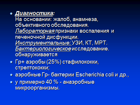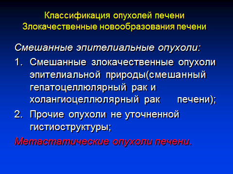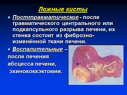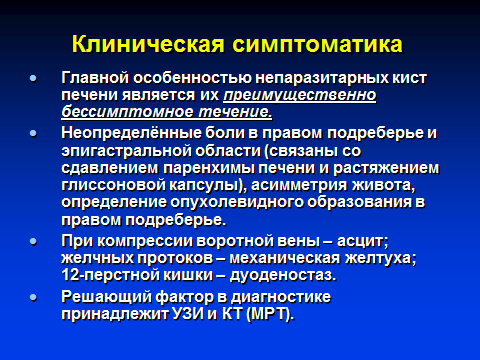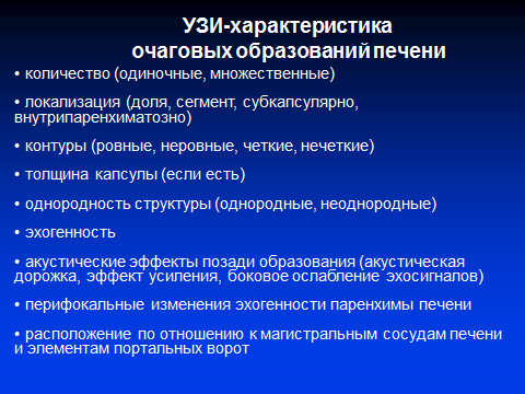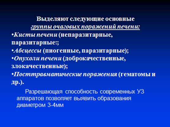 Выделяют следующие основные группы очаговых поражений печени: • Кисты печени (непаразитарные, паразитарные:; • Абсцессы (пиогенные, паразитарные); • Опухоли печени (доброкачественные, злокачественные); • Посттравматические поражения (гематомы и др.). УЗИ-характеристика очаговых образований печени • количество (одиночные, множественные) • локализация (доля, сегмент, субкапсулярно, внутрипаренхиматозно) • контуры (ровные, неровные, четкие, нечеткие) • толщина капсулы (если есть) • однородность структуры (однородные, неоднородные) • эхогенность • акустические эффекты позади образования (акустическая дорожка, эффект усиления, боковое ослабление эхосигналов) • перифокальные изменения эхогенности паренхимы печени • расположение по отношению к магистральным сосудам печени и элементам портальных ворот