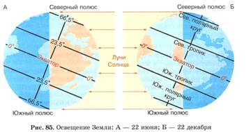 Климат той или иной местности зависит от многих причин. Главные из них — географическая широта местности, ее высота над уровнем моря, рельеф, близость к морям и океанам, океанические течения, направление господствующих ветров. 1. Зависимость климата от географической широты. Солнечные лучи, попадая на земной шар под разным углом, по-разному согревают его поверхность. Неравномерно нагревается и воздух. Самый большой угол падения солнечных лучей на земную поверхность в тропическом поясе, следовательно, он получает больше всего тепла. Чем дальше от экватора, тем меньше угол падения солнечных лучей на земную поверхность, а значит, воздух нагревается меньше. В умеренных поясах летом тепло, а зимой температура падает ниже 0 С. Полярные пояса имеют холодный климат.