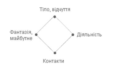 Як людина сприймає своє тіло? Як переживає він різні відчуття та сприймає інформацію з навколишнього світу? «Тіло» означає, що людина тілесна, він володіє певною фізичною формою і фізіологією. Потреби, що задовольняються в цій сфері: сон, харчування, сексуальність, розслаблення. Проявами конфліктів у сфері тіла можуть бути розлади сну, втрата апетиту, переїдання, захворювання органів, дратівливість, безконтрольний прийом їжі, вітальна депресія, сексуальні розлади, стомлюваність, болю, адинамія, акустичні та оптичні галюцинації, а також порушення сприйняття, потягів і афективні розлади. Активність людини в цій сфері виражаеться через зайняття спортом, свідоме чи несвідоме використання фізичних навантажень у якості способу боротьби з конфліктами. До цієї сфери належить також турбування щодо своєї зовнішності зокрема, та здоров’я в цілому. Захворювання того чи іншого органу у пацієнта з психосоматичним захворюванням стає зрозумілим при погляді на концепції, яких він дотримується стосовно до тіла в цілому, окремим його органам та їх функцій, а також до здоров'я і хвороби. Вони визначають у загальній взаємозв'язку зі змістом конфлікту, чому одна людина реагує своїм серцем, інший - шлунком, органами дихання, шкірою і т.д. Діяльність (розум): вимір цього має особливе значення в індустріальному суспільстві, перш за все в американо-європейських колах. Сюди ж відносяться способи становлення норм діяльності та їх включення в концепцію Я. Мислення і розум роблять можливим систематично і цілеспрямовано вирішувати проблеми і оптимізувати діяльність. Можливі дві різноспрямовані ре акції втечі: а) «втеча» в роботу; б) «втеча» від вимог діяльності. Типові симптоми - проблеми самооцінки, перевантаження, стресові реакції, страх звільнення, порушення уваги і «дефіцітарние» симптоми, такі як пенсійний невроз, апатія, зниження активності і т.д.Концепциї: «Кончил дело — гуляй смело» и «Без труда не вытащишь и рыбки из пруда»; «Время — деньги» и т.д. Розлади мислення та інтелекту, порушення уваги, пам'яті, труднощі в ухваленні рішення, схильність до раціоналізації, мрійливість, нав'язливості, дереалізація і т.д. відносяться до діяльності. Потреба структурувати, змінювати, перетворювати світ є однією з базових потреб людини. Основні поняття цієї сфери: діяльність, робота, досягнення, успіхи. Контакти (традиція): ця сфера має на увазі здатність встановлювати і підтримувати стосунки з самим собою, партнером, сім'єю, іншими людьми, групами, соціальними верствами і чужими культурними колами; ставлення до тварин, рослин і речей. Соціальна поведінка формується під впливом набутого досвіду і отриманої спадщини (традиції), особливо це стосується становлення наших можливостей налагоджувати контакти. Існують соціально обумовлені критерії вибору, які ними керують: наприклад, людина хоче від партнера ввічливості, щирості, справедливості, акуратності, спільності певних інтересів і т.д. і вибирає собі партнера відповідно до цих критеріїв. Фіксації, забобони, стереотипи, фанатизм, слабкість суджень, боязнь правди, почуття ненависті, почуття провини, маргінальність і однобічність пов'язані з традицією, контактами. Також сюди відноститься те, наскільки часто людина переживає конфлікти за допомогою спілкування з іншими людьми - через поради, обговорення пробле
