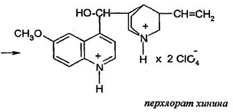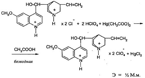 Определение солей. В неводных средах могут быть оттитрованы соли органических азотсодержащих оснований, образованные минеральными или органическими кислотами, а также соли неорганической, природы образованные сильными основаниями и слабыми кислотами. При определении солей органических азотсодержащих оснований, образованных галогенводородными кислотами (HCl, HBr, HI), необходимо принять дополнительные меры для их связывания в малоионизируемые соединения. Это объесняется тем, что галогенводородные кислоты в достаточной степени ионизируют в неводной среде и вновь могут вступать в реакцию солеобразования с определяемым веществом. В таком случае результаты будут занижены. Связывание галогенводородных кислот в малоионизируемые соединения может осуществляться добавлением ртути (II) ацетата или уксусного ангидрида. На практике чаще всего ртути ацетат используют в том случае, если анализируемое вещество растворяют в безводной CH3COOH. Например, в случае солей хинина (гидрохлорида, дигидрохлорида):