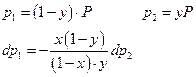 9.3. Состав насыщенного пара идеального раствора. Будем рассматривать бинарный раствор и обозначим через х мольную долю растворенного вещества в растворе, тогда 1-х – мольная доля растворителя. Состав пара над раствором выразим аналогично: у –мольная доля растворенного вещества, 1-у – мольная доля растворителя в паре. Очевидно, далее, что общее давление пара над раствором равно сумме парциальных давлений компонентов: р = р1 + р2 и если раствор идеальный, то