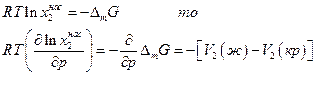 Поскольку Тт2 > T, то 1/Tm2 < 1 / T, следовательно, чем выше температура плавления вещества, тем меньше его растворимость. Заметим, что уравнение Шредера может оказаться весьма полезным для оценки растворимости твердых органических веществ, особенно при разработке процессов перекристаллизации, или для расчета необходимого количества растворителя. Влияние давления на идеальную растворимость можно оценить следующим образом. Так как