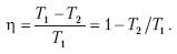 Полагаем, что Т1 > Т 2 и отвод тепла от теплоотдатчика и подвод тепла к теплоприемнику не влияют на их температуры, T1 и T2 остаются постоянными. Обозначим параметры газа при левом крайнем положении поршня теплового двигателя: давление – Р1 объем – V1, температура Т 1. Это точка 1 на графике на осях P-V. В этот момент газ (рабочее тело) взаимодействует с теплоотдатчиком, температура которого также Т 1. При движении поршня вправо давление газа в цилиндре уменьшается, а объем увеличивается. Это будет продолжаться до прихода поршня в положение, определяемые точкой 2, где параметры рабочего тела (газа) примут значения P2, V2, T2. Температура в этой точке остается неизменной, так как температура газа и теплоотдатчика одинакова в процессе перехода поршня от точки 1 к точке 2 (расширение). Такой процесс, при котором Т не изменяется, называется изотермическим, а кривая 1–2 называется изотермой. В этом процессе от теплоотдатчика к рабочему телу переходит теплота Q1. В точке 2 цилиндр полностью изолируется от внешней среды (теплообмена нет) и при дальнейшем движении поршня вправо уменьшение давления и увеличение объема происходит по кривой 2–3, которая называется адиабатой (процесс без теплообмена с внешней средой). Когда поршень переместится в крайнее правое положение (точка 3), процесс расширения закончится и параметры будут иметь значения Р3, V3, а температура станет равной температуре теплоприемника Т 2. При этом положении поршня изоляция рабочего тела снижается и оно взаимодействует с теплоприемником. Если теперь увеличивать давление на поршень, то он будет перемещаться влево при неизменной температуре Т2 (сжатие). Значит, этот процесс сжатия будет изотермическим. В этом процессе теплота Q2 перейдет от рабочего тела к тепло-приемнику. Поршень, двигаясь влево, придет в точку 4 с параметрами P4, V4 и T2, где рабочее тело вновь изолируется от внешней среды. Дальнейшее сжатие происходит по адиабате 4–1 с повышением температуры. В точке 1 сжатие заканчивается при параметрах рабочего тела P1, V1, T1. Поршень возвратился в исходное состояние. В точке 1 изоляция рабочего тела от внешней среды снимается и цикл повторяется. Таким образом, цикл Карно можно считать обратимым. Хотя при этом не учитывались различные сопутствующие потери (тепла в окружающую среду, на трение и некоторые другие условия идеализации). Коэффициент полезного действия идеального двигателя Карно: