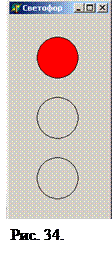 4. Написать функцию OnShape, которая вызывается из процедуры FormMouseMove. 5. Работа функции определяет следующие события: Если указатель мыши не наведен на лампочку, то ее цвет будет прозрачным. Если указатель мыши наведен на лампочку, то ее цвет будет соответствовать цветам светофора. r:= sh.Width div 2; {r - радиус фигуры} cx:= sh.Left + r; {cx, cy – координаты центра фигуры} cy:= sh.Top + r; d2:= (X – cx) * (X – cx) + (Y – cy) * (Y – cy); {d2 – квадрат расстояния от центра} OnShape:= bsClear; {указатель мыши не наведен на лампочку, т.е. находиться за пределами фигуры} if d2 > r*r then ObShape:= bsSolid; {указатель мыши наведен на лампочку, т.е. находиться внутри фигуры} 6. Выравнивание элементов: 1) Выделить все три фигуры. 2) Выбрать команду Edit → Align (Правка → Выровнить). 3) Откроется диалоговое окно Alignment (Выравнивание). 4) Установить слева переключатель Center in Window (Центрировать в окне). 5) Установить справа переключатель Space Equally (С равными промежутками). 6) Щелкнуть на кнопке OK. 7. Сохраните проект, запустите и протестируйте его.
