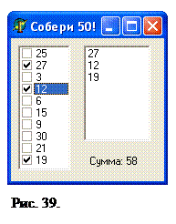 Выполнить следующие действия: 1. После запуска программы в окне изображается список чисел Ллойда. 2. Выбираем с помощью флажков числа и помещаем в правое окно. 3. Сумма выбранных чисел представлена в виде надписи. 4. Для выхода из программы необходимо щелкнуть мышью на закрывающей кнопке в строке заголовка. Описание плана разработки программы 1. Открыть новый проект. 2. Разместить на форме экземпляры компонентов: список флажков CheckListBox, надпись Label, список ListBox. 3. Выполнить следующие действия: