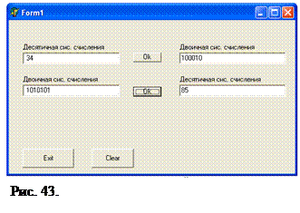 Фрагмент подпрограммы (для вычисления функции Cos(x)) if Edit1.Text <> '' then Begin a:= StrToFloat (Edit1.Text); c:= cos (a); end; if Edit2.Text <> '' then Begin b:= StrToFloat (Edit2.Text); c:= cos (b); end; Edit3.Text:= FloatToStr (c); Добавить на форму кнопки для вычисления функций Tg(x), Log ab. 2. Создать программу, выполняющую перевод чисел из десятичной системы счисления в двоичную систему и обратно.