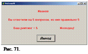 procedure TForm6.Button3Click(Sender: TObject); Var c:real; Begin Form7.Label2.Caption:=Form1.Edit1.Text; Form7.Label1.Caption:='Вы ответили на '+IntToStr(q)+' вопросов, из них правильно '+IntToStr(m); Form7.Label4.Caption:='Ваш рейтинг = '+IntToStr(r); c:=m/q; if c=0 then Form7.Label3.Caption:='Очень плохо' else if (c>0)and(c<0.5) then Form7.Label3.Caption:='Плохо' else if c=0.5 then Form7.Label3.Caption:='Надо доучить' else if (c>0.5) and (c<1) then Form7.Label3.Caption:='Хорошо' else if c=1 then Form7.Label3.Caption:='Молодец!'; Form7.ShowModal; end; При нажатии на кнопке «Ваш рейтинг» на следующей форме появляется результаты рейтенга. Тестирование можно завершить.
