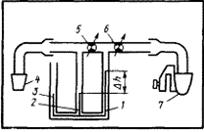Рис.8. Схема расходомера КИ-4887-1: 1—3 - манометры, 4 - входной патрубок, 5, 6 - краны, 7 – эжектор. Внешние проявления неисправностей деталей цилиндропоршневой группы - (поршни, гильзы и поршневые кольца) следующие: - увеличение расхода масла на долив; - ухудшение пусковых качеств двигателя; - снижение мощностных и экономических показателей; - увеличение расхода картерных газов; - существенное ухудшение состояния картерного масла. Диагностирование состояния деталей ЦПГ по указанным проявлениям достаточно затруднено, т.к. на них могут влиять неисправности других узлов и систем двигателя. Например, на пусковые качества двигателя наряду с износом и дефектами деталей ЦПГ могут влиять неисправности системы электрооборудования (аккумуляторных батарей, стартера, генератора) и раз регулировки топливной аппаратуры (увеличение угла опережения впрыска топлива, уменьшение пусковой подачи, снижение производительности подкачивающего насоса и др.). Поэтому при диагностировании деталей ЦПГ необходимо убедиться в исправности других узлов и систем двигателя, оказывающих влияние на работоспособность рассматриваемых деталей. Так, в случаях повышенного расхода масла на долив (выше 1,5 %) необходимо убедиться в отсутствии течи масла из двигателя и разгерметизации впускного тракта.
