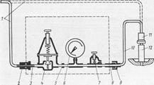 Рис.9 Прибор модели К-69М для определения технического состояния цилиндропоршневой группы двигателя; 1 — шланг от магистрали сжатого воздуха, 2, 11 — быстросъемные муфты, 3 и 8 — штуцера, 4 — редуктор, 5 — калиброванное отверстие, б — манометр, 7 — регулировочный винт, 9 — накидная гайка, 10 — шланг для присоединения прибора к двигателю, 12 — штуцер ввертываемый в отверстие для форсунки. Работа прибора основана на измерении утечки воздуха, подаваемого под давлением в цилиндр неработающего двигателя через отверстие для форсунки. Прибор состоит из редуктора, манометра со шкалой, проградуированной в процентах утечки воздуха, регулировочного винта, входного и выходного штуцеров, шланга для соединения прибора с цилиндром двигателя, быстросъемных муфт для присоединения шланга магистрали сжатого воздуха к прибору и штуцеру, ввертываемому в резьбовое отверстие для форсунки. К прибору прилагаются звуковой сигнализатор для определения конца такта сжатия в цилиндре двигателя перед началом проверки. Для определения начала и конца такта сжатия в дизелях используют щуп-индикатор. Если значение утечки воздуха при положении поршня в в. м. т. больше предельного, следует проверить стетоскопом утечку воздуха через клапаны и убедиться в отсутствии утечки воздуха через прокладку головки цилиндров двигателя. Если при смачивании прокладки головки цилиндров мыльной водой на ней или в наливной горловине радиатора появляются пузырьки воздуха, это свидетельствует о слабой затяжке гаек головки цилиндров или о начале разрушения прокладки. Возможно наличие трещины в блоке цилиндров или камере сгорания. Стуки двигателя прослушивают при помощи стетоскопа, прикасаясь концом стержня или к зонам прослушивания на двигателе. Состояние коренных подшипников коленчатого вала определяют, прослушивая нижнюю часть блока цилиндров при резком увеличении и сбросе оборотов двигателя. Изношенные коренные подшипники издают сильный глухой стук низкого тона, усиливающийся при резком увеличении частоты вращения коленчатого вала. Состояние шатунных подшипников коленчатого вала определяют аналогично. Изношенные шатунные подшипники издают стук среднего тона, по характеру схожий со стуком коренных подшипников, но менее сильный и более звонкий, исчезающий при выключении форсунки прослушиваемого цилиндра. Работу сопряжения поршень — гильза цилиндра прослушивают Состояние сопряжения поршневой палец — втулка верхней головки шатуна проверяют, прослушивая верхнюю часть блока цилиндров при малой частоте вращения коленчатого вала с резким переходом на среднюю. Резкий металлический стук, напоминающий частые удары молотком по наковальне и пропадающий при отключении форсунок, указывает на увеличение зазора между поршневым пальцем и втулкой, недостаточное смазывание или чрезмерно большое опережение начала подачи топлива. Сопряжение поршневое кольцо — канавка поршня проверяют на уровне н. м. т. хода поршня при средней частоте вращения коленчатого вала. Слабый, щелкающий стук высокого тона, похожий на звук от ударов колец одно о другое, свидетельствует об увеличенном зазоре между кольцами и поршневой канавкой либо об изломе колец. Мощность и экономичность двигателя зависят от компрессии в цилиндрах. Компрессия снижается при значительном износе или поломке де