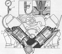 Состояние сопряжения поршень — поршневые кольца — гиль цилиндра можно оценить по количеству газов, прорывающихся картер. Этот диагностический параметр измеряют при помощи расходомера КИ-4887-1 (рис. 8), предварительно прогрев двигатель до нормального теплового режима. Прибор имеет трубу с входных и выходным 6 дроссельными кранами. Входной патрубок 4 присоединяют к маслозаливной горловине двигателя, эжектор 7 для отсоса газов устанавливают внутри выхлопной трубы или присоединяют вакуумной установке. В результате разрежения в эжекторе картерные газы поступают в расходомер. Устанавливая при помощи кранов 5 и 6 жидкость в столбиках манометров 2 и 3 на одном уровне, добиваются, чтобы давление в полости картера было равно атмосферному. Перепад давления м/г устанавливают по манометру 1 одинаковым для всех замеров при помощи крана 5. По шкале прибора определяют количество газов, прорывающихся в картер, и сравнивают его с номинальным (л/мин):