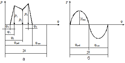 Рис. 2. График изменения сил полезного сопротивления за цикл (а) и график изменения скорости ведомого звена рабочей машины (б): jраб – угол поворота рабочего хода, jхол. – угол поворота холостого хода, V max – максимальная линейная скорость ведомого звена рабочей машины, P 1, P 2, P 3 – значения сил полезного сопротивления при соответствующих углах поворота j0, j1, j2