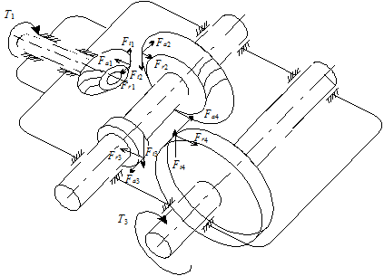 В формулах (15), (16) надо брать верхний знак при совпадении винтовой линии зубьев и внешнего момента, нижний – в противном случае (Ft – направлена в противоположную сторону внешнего момента). Выбор направления действия сил в зацеплении см. рис. 4.