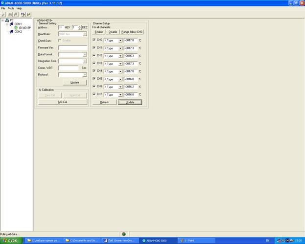 Включение нагревательных элементов, расположенных внутри дома, осуществляется с помощью выключателя «Сеть» и тумблеров «Нагрев 1» и «Нагрев 2». Тумблерами «Имитатор конвекции» и «Вентилятор охл» включаются вентиляторы. Программа, позволяющая работать одновременно с системой управления нагревателями внутри дома и системой сбора информации с датчиков температуры (термопар), содержится в папке «Дом с управлением». Перед началом работы с программой необходимо осуществить установку режимов работы управляющей и измерительной систем. Эта операция осуществляется путем запуска программы «ADAM Utility» из главного меню (Пуск; Все программы; Advantech Automation; ADAM; ADAM – 4000-5000 Utility). При этом открывается следующее окно: