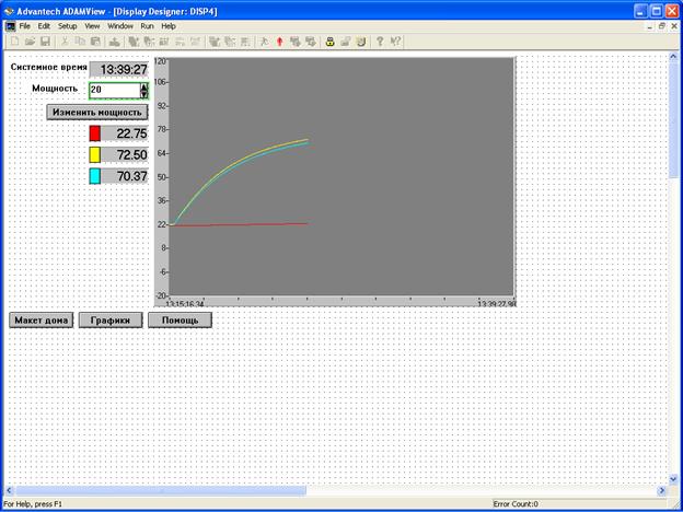 В окошке «Мощность» наберите значение мощности (в % от максимального значения, например, 20) и нажмите клавишу «Изменить мощность». На графике будут изображаться зависимости температуры от времени на опорном датчике (в воздухе вне дома, красный цвет) и на нагревательных элементах (соответственно желтый и голубой цвета).