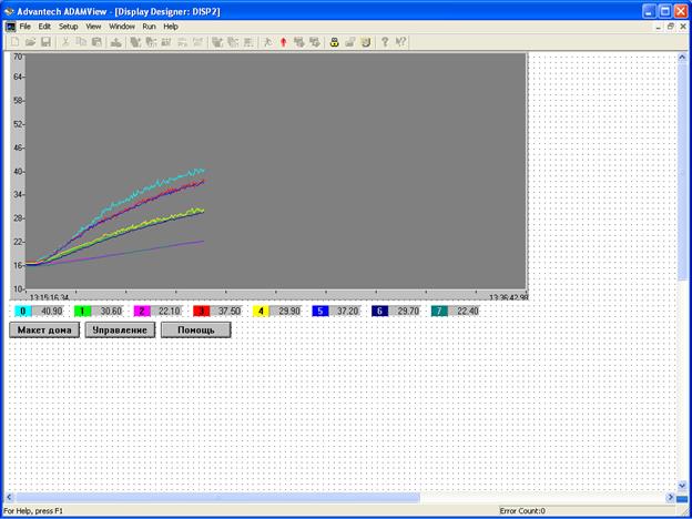 В меню выберите команду Window, Display Designer: DISP2. Откроется окно с графиками зависимости температуры (измеряемой восемью термопарами) от времени.