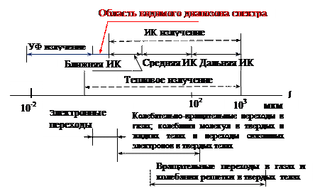 Тепловое излучение является по своей природе электромагнитным, т.е. содержащий электромагнитные волны всевозможных частот при любой температуре и возникает в результате изменения энергетических состояний атомов, молекул и ионов, входящих в состав излучающего тела. Тепловое излучение обуславливается колебаниями электрических зарядов, входящих в состав вещества, т.е. электронов и ионов. Вследствие значительной массы колеблющихся ионов при их колебании излучается длинноволновое электромагнитное излучение, соответствующее инфракрасному диапазону длин волн. Движение электронов, входящих в состав атомов или молекул, инициирует более коротковолновое излучение, соответствующее видимому и ультрафиолетовому излучениям. Излучение тела сопровождается потерей энергии. Для того чтобы обеспечить длительное излучение энергии, совершаемое за счет энергии теплового движения заряженных частиц вещества, необходимо пополнять убыль внутренней энергии, сообщая телу соответствующее количество теплоты. В состоянии равновесия тело излучает столько энергии, сколько поглощает ее. Тепловое излучение, как наиболее распространенный вид электромагнитного излучения в природе, является равновесным излучением. В состоянии термодинамического равновесия тело поглощает в единицу времени столько же энергии, сколько и излучает. Если оно начнет излучать в единицу времени больше энергии, чем получает ее, то температура тела начнет понижаться и уменьшится количество излучаемой телом энергии до уровня, когда, наконец, не установится равновесие. Такое равновесное состояние устойчиво, т.е. при нарушении его, равновесное состояние вновь установится. Способность теплового излучения находиться в равновесии с излучающим телом отличает тепловое излучение от других видов излучения тел. Равновесному излучению можно приписать температуру тела, с которым оно находится в равновесии, распространив при этом законы равновесной термодинамики на тепловое излучение. Это означает, что для равновесного теплового излучения можно определить и рассчитать внутреннюю энергию, давление, энтропию и другие термодинамические характеристики, которые не будут изменяться со временем. Равновесное тепловое излучение однородно, то есть его плотность энергии одинакова во всех точках внутри полости, где оно заключено. Такое излучение изотропно и неполяризовано, т. е. оно содержит все возможные направления распространения и направления колебаний векторов Все другие виды излучения тел являются неравновесными и называются люминесценцией. Область спектра электромагнитных волн, соответствующую тепловому излучению, принято разделять на следующие спектральные диапазоны: ультрафиолетовый (0,2 – 0,4 мкм), видимый (0,4 – 0,72 мкм) и три инфракрасных – ближний (0,72 – 2,5 мкм), средний (2,5 – 25 мкм) и дальний (25 – 1000 мкм). Спектр электромагнитного излучения в тепловой области изображен на рис. 1а. Термин «тепловое излучение» возник в связи с тем, что испускание энергии происходит при нагревании тела или среды. Человеком тепловое излучение воспринимается как тепло или свет.