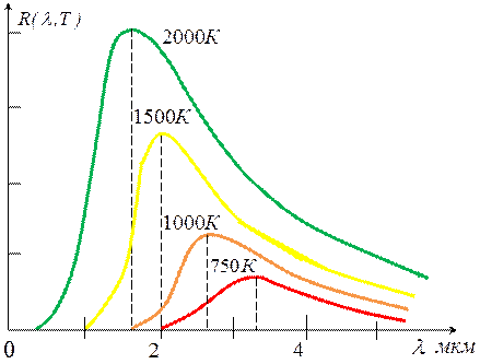 Здесь R (λ, T) – спектральная плотность излучения, т.е. мощность излучения с единицы площади поверхности тела в единичном интервале длин волн; λ – длина волны, м; h – постоянная Планка (h = 6,626∙10-34 Дж∙с); T – абсолютная температура, K; c – скорость света (c = 2,998∙108 м/с); k – постоянная Больцмана (k = 1,380∙10-23 Дж/К). Величина R (λ,T) называется также монохроматической излучательной способностью и зависит от длины волны и абсолютной температуры излучающего тела. Зависимости спектральной плотности излучения АЧТ от длины волны, выраженной мкм, в диапазоне температур от 750 К до 2000 К изображены на рис.4. Из рисунка видно, что значения длин волн λ max, соответствующие максимальной излучательной способности тела при увеличении его температуры, смещаются в сторону более коротких длин волн. Эти зависимости представляют собой плавные кривые с одним максимумом и спадают до нуля при стремлении λ к 0 и к бесконечности.