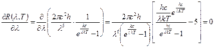 Цель работы: изучить основные закономерности теплового излучения; проверить выполнение закона смещения Вина. Вывод закона смещения Вина из закона Планка Соотношение (1) для спектральной плотности излучения исследуем на экстремум. Для этого функцию R(λ,Т) продифференцируем по λ и полученное выражение приравняем к нулю: