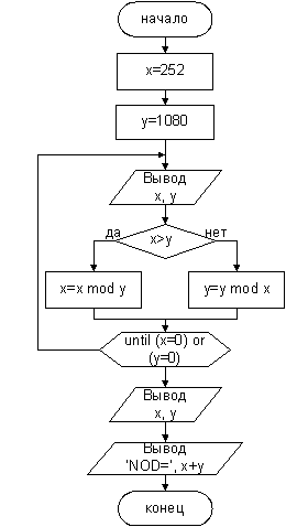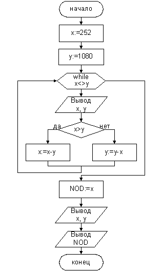 var NOD, x, y: integer; Begin x:=252; y:=1080; while x<>y do Begin writeln(‘x=’,x,’ y=’,y); if x>y then x:=x-y else y:=y-x; End; NOD:=x; writeln(‘x=’,x,’ y=’, y); writeln(‘NOD=’,NOD); readln; End.