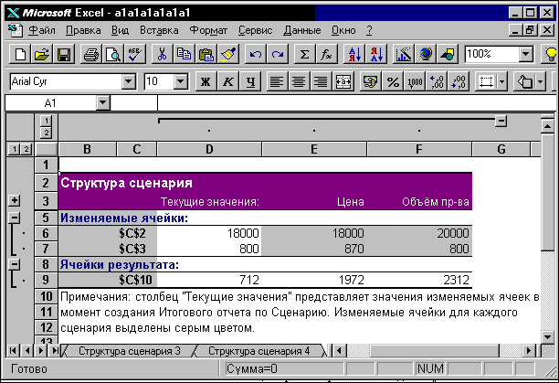 Рис. 10.6. Диалоговое окно Значения ячеек сценария Нажав кнопку Отчет (Summary), попадаем в окно Отчет по сценарию, в котором необходимо указать тип отчета: Структура или Сводная таблица (о сводных таблицах смотрите следующую главу), а также Ячейки результата (рис. 10.7). Нажатие клавиши OK позволяет выдать структурированную итоговую или сводную таблицу (рис. 10.8).