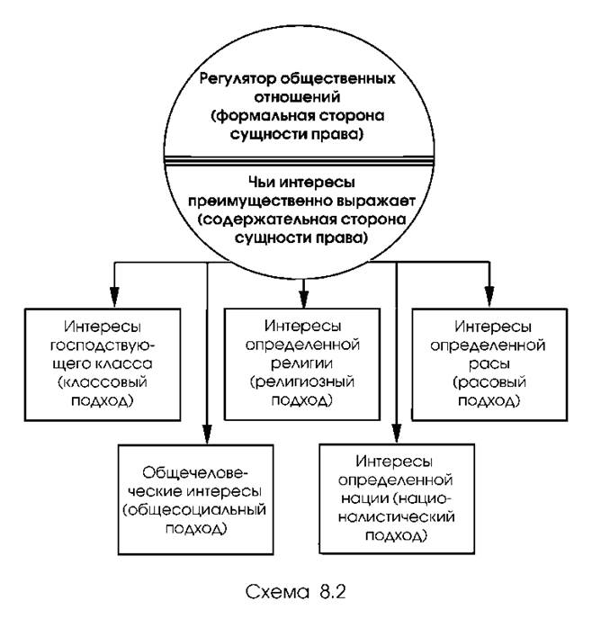 При рассмотрении сущности права важно учитывать два аспекта: 1) то, что любое право есть прежде всего регулятор (формальная сторона); 2) то, чьи интересы обслуживает данный регулятор (содержательная сторона). Можно выделить следующие подходы к сущности права: - классовый, в рамках которого право определяется как система гарантированных государством юридических норм, выражающих возведенную в закон государственную волю экономически господствующего класса (здесь право используется в узких целях, как средство для обеспечения главным образом интересов господствующего класса); - общесоциальный, в рамках которого право рассматривается как выражение компромисса между классами, группами, различными социальными слоями общества (здесь право используется в более широких целях, как средство закрепления и реального обеспечения прав человека и гражданина, экономической свободы, демократии и т.п.). Наряду с этими основными можно выделить и религиозный, и национальный, и расовый, и иные подходы к сущности права, в рамках которых соответственно религиозные, национальные и расовые интересы будут доминировать в законах и подзаконных актах, правовых обычаях и нормативных договорах. Иначе говоря, сущность права многоаспектна. Она не сводится только к классовым и общесоциальным началам. Поэтому в сущности права в зависимости от исторических условий на первый план может выходить любое из вышеперечисленных начал.