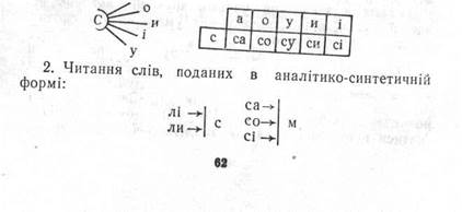ївду навчання грамоти — від звука до букви. Основна частина уроку, на якому учні ознайомлюються з новою буквою, може складатися з таких етапів: І. Підготовчі артикуляційно-слухові вправи. 1. Виділення звуків [с], [с'\ із скоромовки, напри Босий хлопець сіно косить, роса росить ноги босі. 2. Активне вимовляння виділених звуків, спостере 3. Віднесення виділених звуків до приголосних; зі 4. Вправи на впізнавання звуків [с], [с'\ у заданих 5. Самостійний добір учнями слів із звуками [с], [с'\ 6. Аналітичні і синтетичні вправи із звуками [с], [с'\ II. Ознайомлення з буквою «ес». 1. Учитель повідомляє, що звуки [с], [с'\ позначаю 2. Зіставлення малої і великої літер с, С (за формою 3. Ознайомлення з місцем букви с у касі розрізної III. Вправи з читання. 1. Читання таблиці складів з буквою с (променевид-ної чи лінійної): 3. Читання слів у колонках з опорою на виділені сини ліси лісова носили син ліс лісові носив 4. Читання колонки слів за букварем. IV. Ознайомлення з текстом. 1. Вступна бесіда на тему тексту з використанням 2. Читання тексту вчителем. 3. Колективне чктання-аналіз речень, побудованих із V. Підсумок уроку. Ознайомилися з новою лі [с'\. Вчилися читати склади і слова з буквою с. Запитання і завдання 1. Схарактеризуйте основні етапи букварного періоду в сучасній 2. Доведіть доцільність одночасно-паралельного ознайомлення 3. У чому полягають особливості першого етапу букварного пе 4. Усно опишіть прийом навчання дітей читати прямий склад (на прикладі однієї з літер). 5. Розробіть різні завдання до читання слів у колонках за бук 6. Схарактеризуйте завдання, які стоять перед учителем під час 7. Користуючись букварем, розробіть план уроку на вивчення од 8. За методичним посібником М. С. Вашуленка «Навчання гра