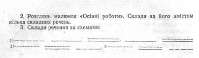 Утворюючи речення за поданими зразками і схемами, учні практично засвоюють сполучники і сполучні слова, якими зв'язуються частини складного речення, набувають пунктуаційних навичок. Робота зі складним реченням має проводитися не тільки на спеціально відведених програмою уроках, а й на уроках вивчення інших тем, розвитку зв'язного мовлення. Учитель не повинен залишати поза увагою складні речення, які потрапляють у поле зору при читанні текстів вправ або речень, складених самими учнями. При вивченні частин мови, повторенні в кінці чверті або року треба пропонувати учням вправи на аналіз і побудову складних речень. Доцільними будуть, наприклад, такі завдання: 1. Поділіть складне речення на кілька окремих речень. Відшу 2. З'єднайте за змістом два речення у складне. Використайте для Надворі йшов дощ. Хлопці не переставали грати. Вони дуже люблять футбол. 3. Відшукайте помилки і виправте їх. Будівельники говорять. Що їх будинки будуть жити вічно. Котик ходить тихо, а на лапках він має подушечки. 4. Серед поданих речень відшукайте складні. Колишеться безкрає поле. Вітер гонить одну за одною колоскові хвилі, пурхають перепели. Ще мине тиждень, і почнуться жнива. Микита сидить на сторожовій вишці і вдивляється (/ степ. 5. Поділіть текст на окремі речення. Врахуйте, що одне з них — Олег виліз з-під човна коли злива прокотилася над Дніпром надворі було тихо над головою світили зорі на землю спустилася тепла ніч Олег взяв весла і сів у човен (За Д. Бедзиком).