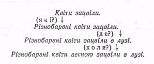 Малий синьоокий хлопчина захоплено читає цікаву книжку про тварин. Малий хлопчина захоплено читає цікаву книжку про тварин. Хлопчина захоплено читає цікаву книжку про тварин. Хлопчина захоплено читає книжку про тварин. Хлопчина читає книжку про тварин. Хлопчина читає книжку. Далі речення вже скорочувати не можна, бо відсутність слова «книжку» надасть реченню зовсім іншого змісту: «Хлопчина читає» вже сприймається із значенням «хлопчина вміє читати» або «хлопчина зайнятий читанням». 5. Об'єднання кількох речень в одно з однорідними Івасик уміє добре читати. Івасик уміє гарно писати. Іва-сик може і гарно малювати. — Івасик уміє добре читати, гарно писати і малювати. Це теж вправа на удосконалення висловлювання — учні вчаться уникати без потреби повторення одних і тих самих слів. 6. Складання речень з конкретними завданнями: з го 7. Складання речень за схемою. Вони можуть бути 1) др. чл. підмет др. чл. присудок.