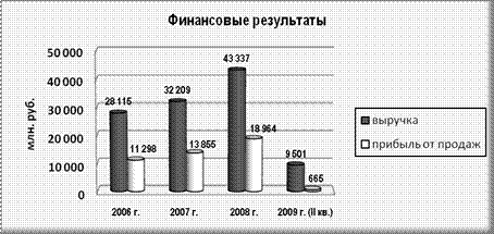Рис. 5 «Стоимость продукции компании» По данным диаграммы видно, что в период стабильного развития мировой и национальной экономики, цены на железорудное сырье динамично увеличиваются, так с 2006 по 2008 г., стоимость концентрата выросла на 85,4%. Цены на агломерат увеличиваются за этот период на 108%. Так же заметно увеличивается стоимость на окатыши, которая за два года выросла на 55 долл. за тонну, т.е на 92%. Под воздействием кризисных процессов, рыночная конъюнктура существенно меняется. Сокращение мирового потребления (спроса) в результате приводит к сжатию производства, оказывая влияние на стоимость сырьевых товаров, в том числе и на стоимость продукции анализируемого предприятия. В начале 2009 г. средние цены относительно 2008 года, заметно снижаются. Концентрат дешевеет на 44%, окатыши на 68%. Средневзвешенные цены на агломерат и аглоруду за полгода сокращается примерно на 65%. Вывод: негативные изменения скажутся непосредственно на результатах хозяйственной деятельности компании, т.е. приведут к резкому уменьшению выручки и соответственно прибыли от продаж. Безусловно, подобный разворот будет следом менять значения всех изучаемых показателей в отрицательную сторону. На основе данных таблицы 5 построим диаграмму отражающую динамику финансовых результатов за период с 2006 по 2009 г. (рис. 6), проанализируем ее изменения.