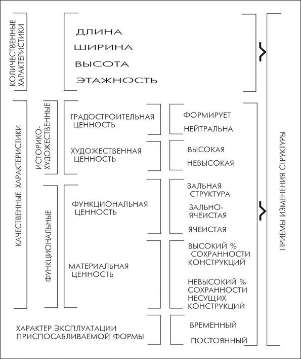Ознаки належності будівель до історичної забудови підрозділяються на дві великі групи. Перша вміщує дві групи ознак: 1. Ознаки належності будівлі до цінного містобудівного середовища (групові ознаки): - належність до комплексу забудови, єдиного в хронологічному та стильовому відношенні; - композиційний зв'язок з пам’яткою або комплексом пам’яток архітектури; - належність будівлі до різночасового ансамблю або комплексу забудови. 2. Ознаки власної історико-архітектурної цінності будівлі (індивідуальні ознаки): - збереженість стильових особливостей, деталей або початкового планування; - унікальність планувального рішення, конструкцій або деталей; - меморіальна цінність, зв’язок із історичними подіями. Друга група ознак підрозділяється на: 1. Ознаки функціональної цінності будівлі: - можливість багатофункціонального використання, яка обумовлена трьома факторами: • настільки ємною і досконалою структурою будівлі, що вона може вмістити одночасно або в різний час різноманітні функціональні процеси; • такою структурою будівлі, яка дозволяє множену вариантів пристосування для різного використання; • певним ступенем універсальності внутрішнього простору, яким можна користуватись по-різному без сутнісних перепланувань; - можливість максимального забезпечення однієї провідної функції, тобто явна функціональна спеціализація будівлі. 2. Ознаки матеріальної і конструктивної цінності будівлі: - ступінь довговічності і збереження основних конструкцій. Усі перераховані ознаки дозволяють віднести будівлю до категорії історичної забудови. Однак, перша група – історико-художня цінність – має вирішальне значення. Конкретна будівля може мати повну сукупність ознак або ж тільки деякі з них. Розвиток рядової історичної забудови полягає в безперервній зміні та нарощуванні часових шарів (діахронність). Якщо нашарування епох в пам’ятках архітектури не завжди сприймається позитивно, то часові шари історичної забудови – явище абсолютно закономірне. Завдяки рухливості історичної забудови у часі, можлива спадкоємність у розвитку міста. Часова багатошаровість історичної забудови обумовлює її історико-документальну цінність. Багато історичних будівель повязані з історичними подіями, особами, творами літератури та мистецтва. Забудова зберігає багато інформації з історії міста: ідеології, промисловості, культури та побуту. Друга важлива характеристика історичної забудови – її множинність, на відміну від пам’ятки архітектури, яка виступє як явище одиничне й унікальне. Рядові історичні будинки – кожен окремо – мають скромну архітектурно-художню цінність, яка безмірно виростає в сукупності таких будівель. Ще один аспект цінності історичної забудови пов’язаний зі ставленням сучасної людини до середовища міста. Опредмечена пам’ять культури визначає особливий багатошаровий образ міста, привабливий для людини. При цьому індивідуальність, неповторність кожного з фрагментів історичної забудови, камерність її простору відповідає середовищним потребам мешканця міста. Особливий аспект цінності історичної забудови – функціональний; її надзвичайна «живучість», тобто здатність до зміни вигляду й можливість пристосовуватися до сучасних соціальних вимог. Історична забудова дозволяє множину варіантів пристосування, без втрати