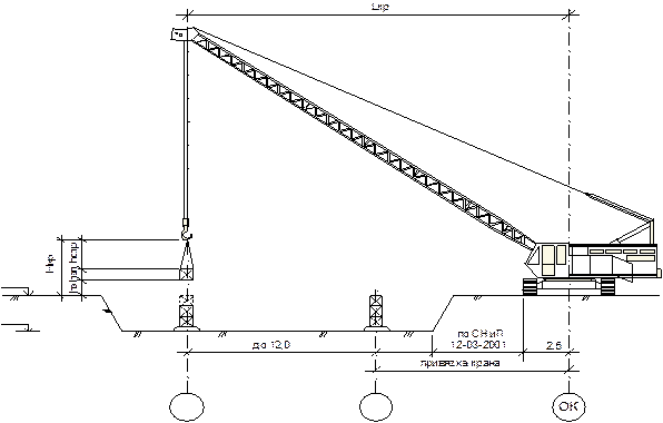 Выбор крана осуществляется в следующей последовательности: 1. Вычертить в масштабе поперечный разрез котлована, нанести оси фундаментов. - грузоподъемность (Q) - длина стрелы (l стр)