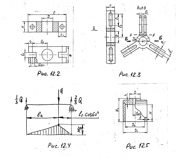 а1 = хс - х1; а2 = х2 - хс. Величины допускаемых напряжений: для чугуна [σ]р=40…60Мпа, [σ]=130…150Мпа; для стали [σ]р ≈[σ] =90…110Мпа. 12.2. Задание № 2: Корпус съёмника для шкивов рис 12.2. Материал – сталь: ст.3; ст.4; 35; 45. Размеры, определяемые по заданным и полученным параметрам: D=Dнг; Dнг – наружный диаметр гайки; dоси= d0; d0 – диаметр оси; Н ≥ l з – по заданному диаметру шкива и конструкции захвата; В ≥ Dб; Dб- диаметр буртика гайки; в 1= в; в – толщина захвата; с1= h+(4…6)мм; h – ширина захвата; с2= l /2+(2…3)мм. Остальные размеры определяются конструктивно. Корпус работает на изгиб как двухопорная балка, нагруженная посредине силой Q. Напряжения в среднем сечении такой балки с учетом ослабления отверстием D.