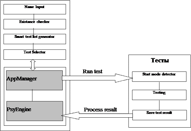 Описание блоков: · Оболочка: · Name input – блок ввода имени; · Existance checker – проверка базы данных на существование записи с таким именем; · Smart test list generator – генерация списка тестов зависит от того, был ли тестирован респондент ранее; · Test selector – выбор тестов на выполнение; · AppManager – запуск выбранных тестов на исполнение; · PsyEngine – сохранение результатов тестирования; · Тесты: · Start mode detector – определение режима запуска (сепаратный или режим приложения); · Testing – собственно режим тестирования; · Save test result – сохранение результата тестирования.
