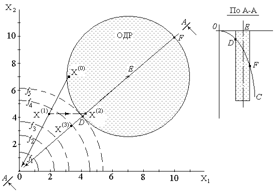 Получено решение с точностью до 1%.: В задаче поверхностью отклика функции цели являлся параболоид вращения, у которого ось симметрии совпадала с вертикальной осью координатной системы. Для такой поверхности любая вертикальная плоскость, проведенная через ось, даст на поверхности параболоида кривую (например, кривая ОDFC, рис.21)– наикратчайшее расстояние между любой точкой, лежащей на кривой, и вершиной (глобальным экстремумом) поверхности параболоида. Симметричность поверхности функции цели относительно вертикальной оси координат подтверждается структурной однотипностью формул частных производных функции цели, т.е. градиента функции. На рис.21 представлены положения четырех первых точек процесса итерации. На первом итерационном шаге совершен переход от точки Так как план