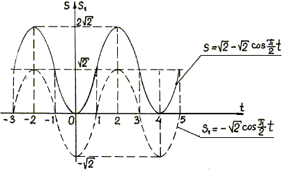 Из закона (в) следует, что координата s не может быть отрицательной, т.е. точка движется по полупрямой М0М (рис.1.2) и ось х не пересекает (см. по этому поводу п. 3 решения задачи). 5. График движения точки – это графическое представление зависимости расстояния s от времени t. Для построения такого графика по оси абсцисс откладывают последовательные значения времени t, а по оси ординат – соответствующие им значения расстояния s. Построенные точки соединяют плавной линией. График зависимости (в) можно построить быстрее, если воспользоваться известным графиком косинуса. Для этого вначале построим график функции
