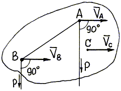 Рис. 3.7 Рис. 3.8 Рис. 3.9 в) Если скорости точек А и В (рис. 3.9) взаимно параллельны, а точки лежат на общем перпендикуляре к скоростям, то МЦС (точка Р) находится на пересечении указанного общего перпендикуляра АВ и прямой 1–1, проведенной через концы векторов скоростей этих точек. Это следует из соотношения (3.9).