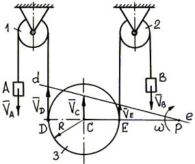 Мгновенный центр скоростей Р блока 3 лежит на пересечении общего перпендикуляра DE к скоростям` VD и` VE с прямой de, проведенной через концы векторов этих скоростей (см. способ (в) определения положения МЦС). Угловая скорость подвижного блока