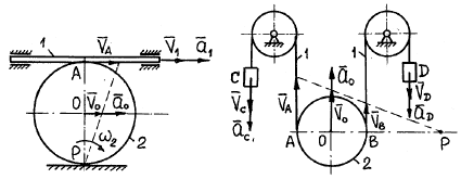 Рис. 3.31 Рис. 3.32 В шарнирных соединениях звеньев центр шарнира принадлежит одновременно двум звеньям. Вследствие этого, например, ускорение точки А на рис. 3.31, определенное для вращающегося кривошипа ОА, будет таким же как и ускорение точки А колеса 1, совершающего плоскопараллельное движение. Аналогичные рассуждения для точки А механизма на рис. 3.32. Отметим некоторые особенности при выборе полюса. Если звено АВ механизма, совершающего плоскопараллельное движение, присоединено к ведущему звену ОА шарниром А (рис. 3.31, 3.32), то за полюс звена АВ следует взять центр шарнира А, ускорение которого можно определить при решении задачи об ускорениях звена ОА. Звено механизма, соединенное с ведущим звеном первым способом (рис. 3.29, 3.30), является обычно колесом (или блоком). В этом случае за полюс следует выбирать центр колеса (или блока), ускорение которого можно найти до решения основного векторного уравнения типа (3.10). Покажем это на примере механизмов, изображенных на рис. 3.29 и 3.30. В механизме на рис. 3.29 ведущим звеном является подвижная рейка 1, ее скорость` V1 и ускорение` а 1 известны (рис. 3.33). Скорости точек А1 и А2 одинаковы:` VA2 =` VA1 =` V1. Учитывая, что мгновенный центр скоростей колеса 2 находится в точке P, найдем