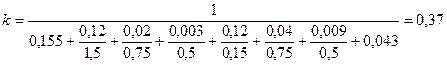 2) Тепловые потери через стены штукатурка цементная: δ=0,01 м, λ=1 Вт/м·К. вата минеральная: δ=0,05 м, λ=0,055 Вт/м·К, кладка из обожженного кирпича: δ=0,52 м, λ=0,6 Вт/м·К, штукатурка цементная: δ=0,01 м, λ=1 Вт/м·К. По формуле (8) рассчитываем коэффициент теплопередачи через стены: