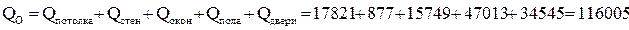 где QОП – мощность отопительных приборов, Вт; QО – теплота, теряемая через ограждающие конструкции помещения, Вт; QВ – теплота, теряемая с удаляемым из помещения воздухом, Вт; QИ – теплота, затраченная на испарение влаги, Вт; QЖ – теплота, выделяемая животными, Вт. а) Теплоту, теряемую через ограждающие конструкции, определяем как сумму потерь теплоты через отдельные виды ограждения (стены, окна, пол, потолок). Потери через окна, двери, стены и потолок найдем из выражения: