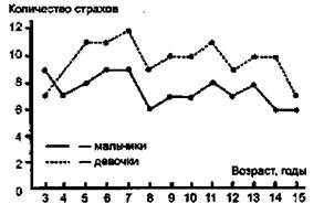 в последующие годы значимость мнимых опасностей снижается, а реальных - возрастает. Среди реальных страхов в дошкольные годы первое место занимает боязнь воды. Второе место занимает страх, вызванный угрозой нападения животных, третье - боязнь падения с большой высоты и боязнь дорожно-транспортных происшествий. Школьники младших и средних классов чаще всего отмечают реальные опасности, затем - мнимые. Имеют место и престижные опасности. Из реальных страхов преобладает боязнь воды и высоты, боязнь животных, опасения за здоровье родных и близких. Среди мнимых страхов выделяются боязнь темноты и недовольства взрослых. Из престижных страхов называются боязнь получения плохой отметки, выступления перед большой аудиторией и др. Это подтверждается и данными Н. К. Сурогиной (1998): у школьников семи-девяти лет в 72 % случаев присутствуют страхи, связанные со школой и обучением, в 53 % - с неуверенностью в отношениях с учителем. Это свидетельствует о наличии дистанции между учителем и учениками, отсутствии между ними полноценного контакта, о недостатке или отсутствии у преподавателей интереса к детям. В старшем школьном и студенческом возрасте на первое место выходят престижные опасности, затем реальные и только потом - мнимые. Из престижных опасностей больше всего боятся неудачи на экзаменах и контрольных, одиночества, безразличия со стороны товарищей, выступления перед большой аудиторией. Из реальных страхов преобладают тревога за здоровье или потерю родных и близких, страх перед хулиганами, бандитами, страх перед большой высотой, страх войны и др. Мнимые опасности связаны с насекомыми, мышами, крысами, медицинскими процедурами. Отмечается боязнь покойников, вида крови, новой обстановки, темноты. Девушки отмечают мнимые опасности в шесть раз чаще, чем юноши. А. И. Захаров (1995), выделив 29 страхов детей, путем опроса последних выявил существенное увеличение их количества в преддошкольном возрасте (рис. 6.5). Кроме того, обнаружилось, что, кроме трехлеток, у девочек количество страхов больше, чем у мальчиков. У взрослых, по данным Захарова, из детских страхов остаются страхи высоты (больше у мужчин) и смерти родителей (больше у женщин). У женщин в значительно большей степени выражены также страх войны, сделать что-либо неправильно или неуспеть (в отношении последнего случая я бы предпочел говорить о тревоге, а не о страхе). Что касается лицевой экспрессии страха и ее различении от других негативных эмоций, то у младенцев одни и те же индикаторы могут свидетельствовать как о страхе, так и о страдании. Отчетливые различия в мимике этих состояний появляются у более старших детей. Date: 2015-09-05; view: 417; Нарушение авторских прав |