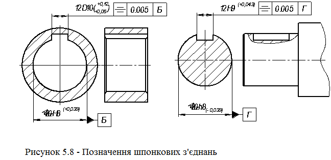 де e 1і е 2 - допуски симетричності паза втулки і вала; Smin 1i Smin 2 - зазори в з'єднаннях відповідно в пазу втулки і в пазу вала; k 1і k 2- коефіцієнти використання зазорів, які можна прийняти k 1 =k 2 = 0,4...0,6. Прийнявши е 1 =е 2, розрахункове значення варто відкоригувати згідно з ГОСТом. На рисунку 5.8 наведені фрагменти креслень, що пояснюють позначення шпонкових з'єднань.