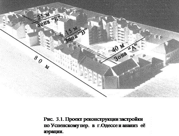 Изменяя соотношение размера двора (L) к высоте зданий (Нзд), архитектор может существенно влиять на ветровой режим застройки: · при L < 1,5 - 2 Нзд - усиливается ветрозащита застройки; · при L > 3 - 4 Нзд - усиливается аэрация застройки. На рис.3.1 приведен пример реконструкции застройки в г.Одессе и анализ аэрации её территории.