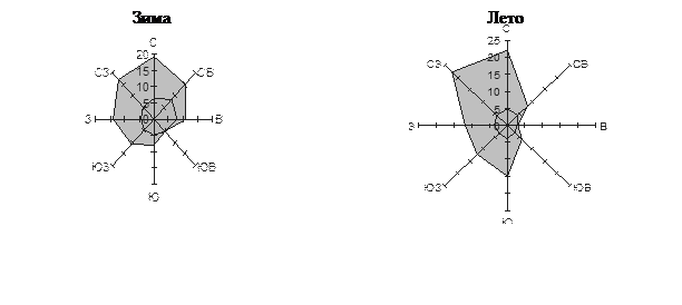 Розы ветров - графическое представление ветровых нагрузок города (см. рис. 3.3), представлены на генплане в левом верхнем углу. Различают розы ветров по повторяемости и скорости; дают информацию о господствующих, опасных и благоприятных ветрах.