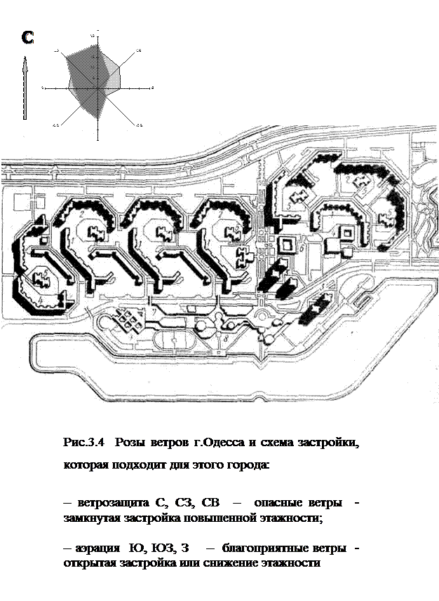 Анализ ветровых нагрузок г.Одесса позволяет установить следующее: Господствующие ветры – Р ≥ 12,5% - (только они учитываются при выборе архитектурных решений по ветрозащите и аэрации территории застройки): зимой – С, СВ, СЗ,З; приближаются - В и ЮЗ; летом – С, Ю, СЗ; приближается - З и ЮЗ; Опасные ветры - (господствующие ветры, от которых нужна ветрозащита): - т.к. г.Одесса находится в ІІІ Б2 климатической зоне, опасными являються господствующие ветры, скорость которых V ≥ 5м/с: зимой - С, СВ, СЗ; приближается → В; летом – приближается → С. Ветрозащита - выбирается для опасных зимних ветров по таблице 3.1; можно использовать следующие виды ветрозащиты: зимой - СЗ – озеленение; С – замкнутая застройка; СВ и В – замкнутая застройка с озеленением; · замкнутая застройка и повышение этажности зданий со стороны опасных зимних ветров; · уменьшение размера двора до L < 1,5 - 2 Нзд для построек круглогодичной эксплуатации; Аэрация - проветривание территории застройки господствующими ветрами, скорость которых в пределах V = 3 - 5м/с: зимой – З, ЮЗ, СЗ – с озеленением; летом – Ю, СЗ, З, ЮЗ, С – с озеленением; · открытая застройка в направление благоприятных летних ветров - Ю, З, ЮЗ; · снижение этажности зданий со стороны СЗ; · увеличение размера двора более L > 3 – 4 Нзд для построек сезонной (летней) эксплуатации. Пример схемы застройки, обеспечивающей аэрацию и ветрозащиту в г.Одессе приведен на рис.3.4