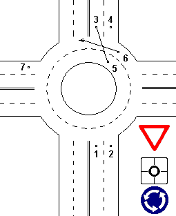 Разбивать перекресток с круговым движением на несколько отдельных перекрестков – некорректно. В понимании действующей редакции ПДД и ГОСТ Р 52289-2004 это – один перекресток. Правила не запрещают выезжать с перекрестка по любой полосе, хотя и требуют «двигаться по возможности ближе к правому краю проезжей части» (п.8.6 ПДД). Если разбивать круговое движение на отдельные перекрестки, то перед выездом с них начинает действовать п.8.5, который обязывает вас занять крайнее правое положение. Чтобы было понятнее, представьте себе обычный перекресток, на котором вам нужно повернуть направо. Вы перед поворотом занимаете крайнее правое положение, а потом должны двигаться как можно правее. Но если на этом пути есть препятствие, никто не запрещает вам в процессе поворота выехать и на вторую, и на третью полосу. Аналогично на перекрестке с круговым движением, за исключением того, что занимать крайне правое положение перед въездом не него не обязательно. На рисунках автомобили, следующие из точек 1 и 2 в точки 3 и 4 каждый по своей полосе, не мешают друг другу – их пути не пересекаются. Руководствоваться при проезде кругового движения следует табличкой «Направление главной дороги». Это особенно важно для многополосного кругового движения. Вам никто не должен мешать, если вы двигаетесь по своей полосе по главной дороге. Если на рисунке 1 автомобиль из точки 2 следует в точку 7, то в точке 6 он обязан пропустить автомобиль 1, следующий в точку 3, который в этот момент будет находиться в точке 5. На рисунке 2 в аналогичной ситуации автомобиль 1 в точке 5 пропускает автомобиль 2. Чтобы избежать такой ситуации, автомобиль 2, следуя в точку 7 на рис.1, должен заранее перестроиться и проехать через точку 5. Аналогично, автомобиль 1, следуя в точку 3 на рис.2, должен заранее перестроиться и проехать через точку 6.