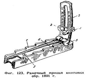 7,62-мм. винтовка обр. 1891 г., принятая на вооружение русской армии в 1891 г., была сконструирована капитаном Мосиным совместно с другими членами образованной для этого комиссии. Винтовка обр. 1891 г. была принята на вооружение в виде двух образцов: пехотного и драгунского. Основные данные пехотной винтовки обр. 1891 г. следующие: • Вес винтовки с пустым магазином и со штыком 4,55 кг. • Общая длина со штыком 173,42 см. • Длина без штыка 130,4 см. Остальные данные одинаковы с винтовкой обр. 1891/1930 гг. Данные драгунской винтовки обр. 1891 г. несущественно отличаются от основных данных модернизированной винтовки обр. 1891/1930 гг. В 1910 и 1930 гг. в винтовке обр. 1891 г. были введены изменения, улучшающие боевые и технические свойства винтовки, после чего на вооружение Красной Армии была принята модернизированная винтовка обр. 1891/1930 гг. Основные конструктивные отличия деталей винтовки обр. 1891 г. от деталей винтовки обр. 1891/1930 гг. Ствол винтовки обр. 1891 г. не имеет на трапецевидном выступе для прицельной колодки отверстия под стопорный винт. Ствольная коробка в винтовке обр. 1891 г. в верхней части имеет три грани, в то время как в винтовке обр. 1891/1930 гг. эта часть по производственным соображениям сделана овальной. Прицел винтовки обр. 1891 г. рамочного типа {фиг. 123). Он состоит из прицельной колодки /, которая своим пазом надвигается на трапецевидный выступ нз стволе и припаивается оловом, прицельной рамки 2, прицельного хомутика 3, двух защелок 4, двух колпачков защелок, оси прицельной рамки 5, пружины прицельной рамки 6 и ее винта 7.