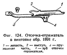 Прицельная колодка имеет две стойки с пятью вырезанными ступенями. Сбоку левой стойки против каждой ступеньки нанесены цифры 4, 6, 8, 10 и 12, соответствующие делениям прицела (в сотнях шагов). Между стойками помещена пружина прицельной рамки, и на ушках на оси 5 закреплена сама прицельная рамка. Прицельная рамка имеет некоторую кривизну, что сделано для более равномерного расположения делений прицела в связи с увеличением прицельной дальности с 2700 до 3200 шагов, введенным в 1910 г. вместе с применением остроконечной пули взамен тупоконечной. Прицельная рамка имеет два продольных гребня с засечками для защелок хомутика и сзади гривку с прорезью для прицеливания. На нижней стороне рамки нанесены цифры от 13 до 32 (четные с левой, нечетные с правой стороны) с промежуточными короткими рисками для установки прицела через каждые 50 шагов. Вследствие того что ствол драгунской винтовки немного короче ствола пехотной, шкала прицела драгунских винтовок несколько иная. Для наружного отличия прицельных рамок пехотных винтовок от драгунских на последних наносилась буква К. Прицельный хомутик перемещается продольными пазами по прицельной рамке и застопоривается в нужном положении защелками. Он имеет посередине окно с прорезью для прицеливания и наблюдения за полем боя. Хомутик пехотной винтовки не имеет выреза на выступе для ограничении передвижения хомутика вниз при вертикально поставленной рамке, так как у пехотной винтовки деления прицела нанесены выше, чем у драгунской. Мушка треугольной формы. Отсечка-отражатель (фиг. 124) в винтовке обр. 1891 г. представляет собою деталь довольно сложной формы и трудную в изготовлении.