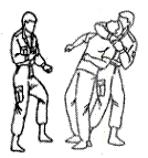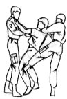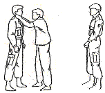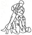 9.14.1. Помощь при подходе сзади используется при различных захватах противником сотрудника (гражданина). Помощь осуществляется, находясь сзади противника (рис. 32), с ударом ступней в его подколенный сгиб и рывком за плечи на себя (рис. 33), отгибанием головы за лоб назад, обхватом шеи плечом и предплечьем, сцепив руки (рис. 34).