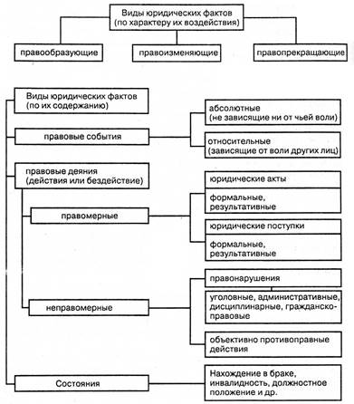 Так, по договору займа в момент передачи денег у лица, получившего деньги (заемщика), возникает обязанность возвратить долг, а у заимодавца - право требовать такого возврата, т.е. возникает правоотношение. Частичный (с согласия последнего) возврат долга соответственно изменяет правоотношение (объем прав и обязанностей сторон), а в случае смерти заемщика - его субъектный состав: стороной правоотношения становится его наследник. Полная же уплата долга прекращает существовавшее правоотношение. Наиболее существенным является деление юридических фактов по их связи с волей участников правоотношения. По этому основанию выделяются правовые действия и правовые события (рис. 6). Действия вообще - это волевые акты поведения, поступки людей. В своей повседневной практике люди совершают бесчисленное число актов поведения, однако лишь с какой-то частью этих актов закон связывает наступление юридических последствий. Только эти акты поведения и будут действиями в юридическом смысле, т.е. правовыми действиями. Такие действия могут быть правомерными, т.е. соответствующими правовым предписаниям, не нарушающими их, и неправомерными, которые правовым требованиям не соответствуют, нарушают их. Правомерные действия в свою очередь подразделяются на юридические акты и юридические поступки. Юридические акты - это такие действия, которые совершены с целью добиться конкретного правового результата (заключение гражданско-правовой сделки или трудового договора, вступление в брак и т.п.). Юридические поступки - такие правомерные действия, которые не преследуют правовых целей, но объективно, независимо от воли и намерений субъекта, порождают правовые последствия. Так, создание литературного произведения или изобретения является актом творчества, но в результате возникают авторские права писателя, поэта, ученого. И юридические акты, и юридические поступки могут быть формальными (если для возникновения правовых последствий достаточно самих действий) и результативными (если правовые последствия порождаются не самими действиями, а их результатами). Так, сам факт передачи денег взаймы порождает обязанность заимополучателя вернуть долг и право другой стороны требовать его возврата. Напротив, юридические последствия судебного решения возникают не из деятельности по его подготовке и написанию, а из самого решения как правового акта; авторское право возникает только после появления произведения литературы, живописи и проч., т.е. и в том, и в другом случае - из результатов деятельности. Юридические последствия могут быть следствием и неправомерных действий. Так, совершение преступления порождает многочисленные юридические последствия: возникают, в частности, обязанности органов дознания выявить и раскрыть преступление, право потерпевшего и других лиц на обращение с заявлением (сообщением) в правоохранительные органы и др. Неправомерные действия делятся на правонарушения (преступления и проступки) и объективно противоправные деяния. Различие между ними в том, что правонарушение порождает, наряду с другими правоотношениями, отношения юридической ответственности (уголовной, административной или иной), а объективно противоправное деяние юридической ответственности не влечет. Например, если малолетний ребенок совершил поджог дачи, то он не может